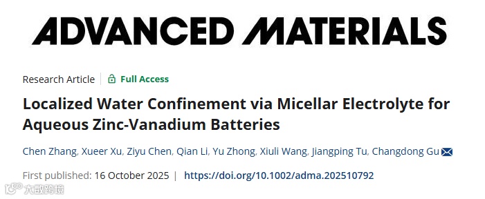 近日,浙江大学谷长栋教授团队在国际顶级期刊《Advanced Materials》上发表题为“Localized Water Confinement via Micellar Electrolyte for Aqueous Zinc‐Vanadium Batteries”的研究论文。该研究提出利用表面活性剂CTAB构建胶束电解液,实现局部水分子限制,有效抑制水引发的级联失效,显著提升了钒基水系锌离子电池正负极两侧的稳定性。文章深入分析了胶束电解质关于水活度抑制与动力学权衡,最终使全电池实现了超过17000次的超长循环寿命。