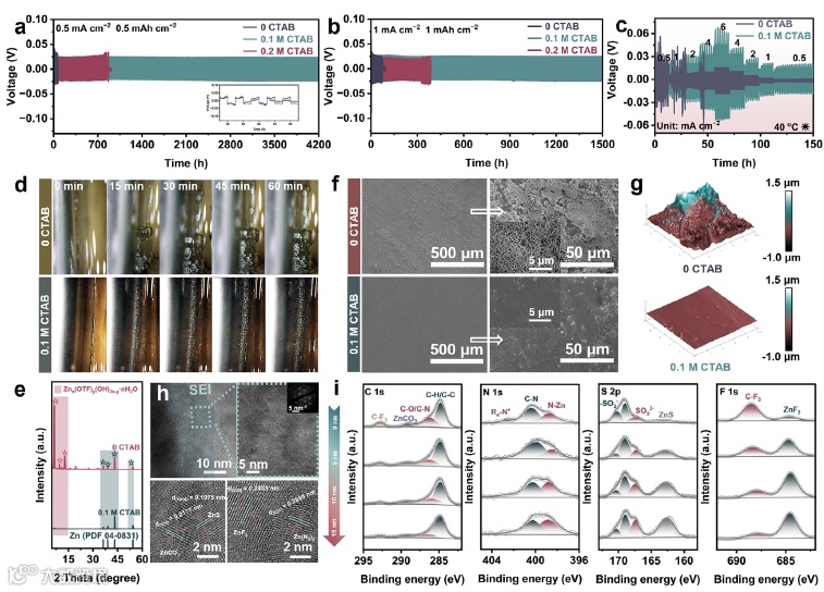 图4. CTAB添加剂对锌负极电化学性能及界面的影响