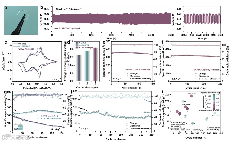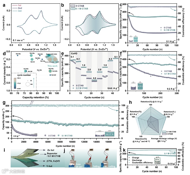 Zn||(CTA, Ca)VO全电池在0.1/0.2/4.0 A g⁻¹下分别实现150/300/17,700次循环后容量保持率93.57%/98.78%/82.17%,在-20°C下也表现出优异的低温性能。该策略还可拓展至NaVO、BaVO等其他钒基材料、准固态电池及无负极电池中。