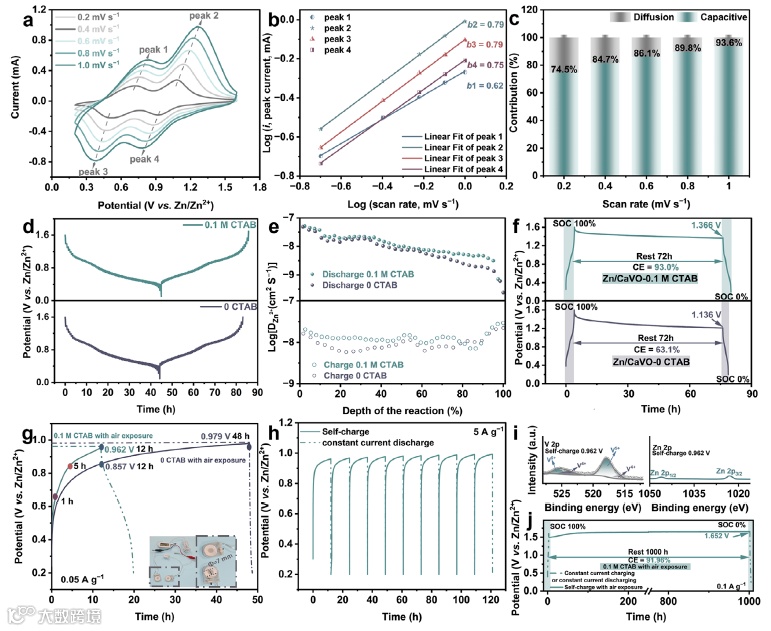 图3. Zn||(CTA, Ca)VO全电池的动力学与自充电性能
