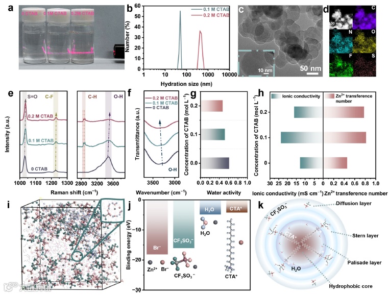 通过在Zn(OTF)₂电解液中引入CTAB,形成CTA⁺胶束结构,将水分子限制在胶束内部,降低水活性。同时,Br⁻进入Zn²⁺第一溶剂化层,重构其溶剂化结构,减少配位水分子数,进一步抑制水引发的副反应。