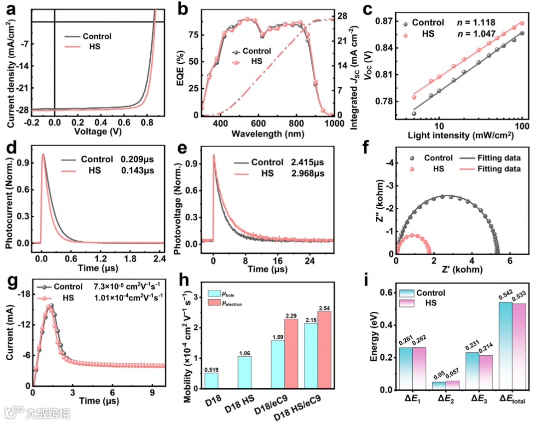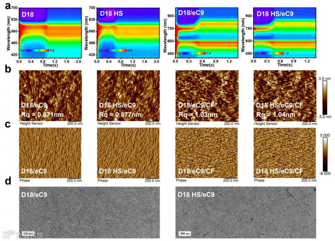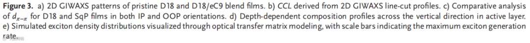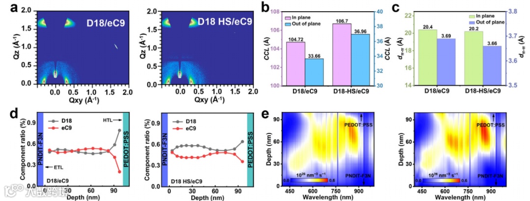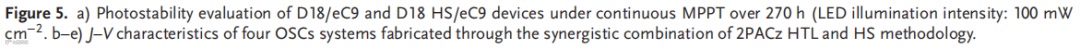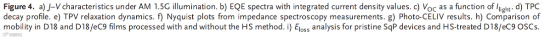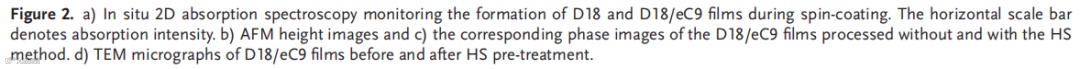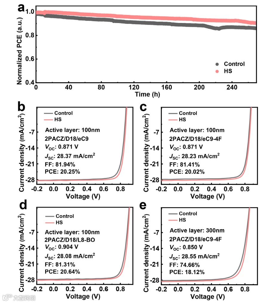 本文采用实时热成像来揭示在热基板(HS)上的顺序处理(SqP)制备活性层膜期间的温度动态演变。与广泛采用的热溶液技术相比,HS工艺在SqP过程中为活性层提供了更高的温度和更长的加热时间,加速了底层的液相重组和成核。HS诱导的界面能差促进层间相互渗透,并在活性层底部区域实现合适的给体含量,同时促进激子的产生。高度结晶的纤维状结构提高了空穴迁移率并抑制了非辐射复合(0.214 eV),产生了高填充因子(81.00%)和开路电压(0.868 V)。100 nm厚的D18 HS/eC9器件实现了19.75%的效率(对照组仅18.89%),并且在270 h后1个太阳光持续照射下保持其初始效率的90%(对照组84%)。在2PACZ作为空穴传输层的情况下,在三个系统中均证明了超过20%的效率:20.02%(D18/eC9-4F)、20.25(D18/eC9)和20.64%(D18/L8-BO,认证为20.10%)。此外,HS处理的300 nm厚的二元器件实现了超过18.12%的效率。