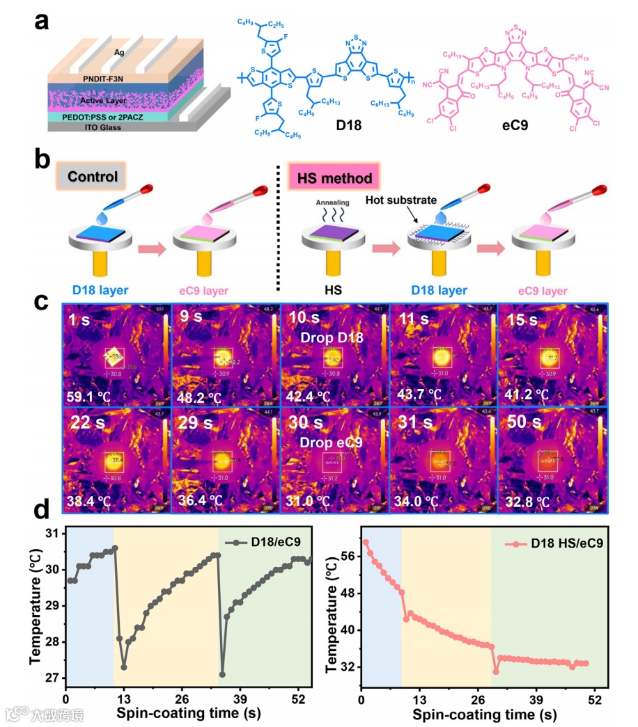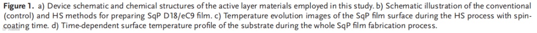 有机太阳能电池(OSCs)因其轻质、柔性和可溶液加工等优势而备受关注,其功率转换效率(PCE)已突破21%,尽管热力学在活性层优化中起着核心作用,但尚未解决的温度依赖机制阻碍了有机太阳能电池效率的进一步提高。当前高性能体系广泛使用的D18给体聚合物虽具有利于电荷传输的刚性平面结构,但其极强的结晶倾向也导致了加工困难。常用的顺序沉积(SqP)工艺面临给受体界面能不匹配的挑战,阻碍了有效的层间渗透,造成激子损失,而传统热溶液法则存在膜厚一致性差的问题。
