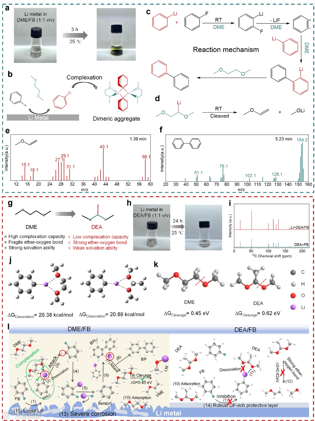 研究深入揭示了FB在DME介质中与锂金属的连锁副反应路径:FB首先与锂反应生成苯基锂,随后在自由DME分子的促进下发生去质子化、LiF消除、苯环加成等步骤,最终生成联苯等副产物,导致电解液分解。为阻断这一过程,作者创新性地引入具有“支链”结构的二甲缩醛(DEA)作为新溶剂。DEA能有效降低与苯基锂的配位能力,抑制其解离与FB的去质子化,从而在分子层面切断副反应链,实现锂金属在DEA/FB混合体系中的长期稳定共存。