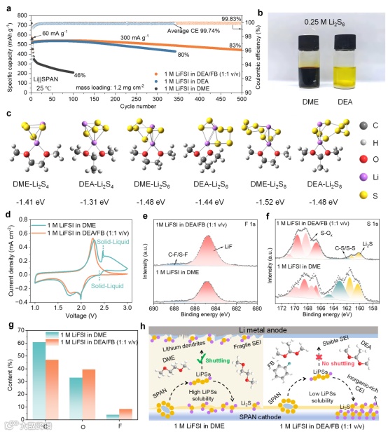 将1 M LiFSI的DEA/FB (1:1 v/v)电解质用于锂-硫化聚丙烯腈(SPAN)电池,展现出优异的正极兼容性。电池在500次循环后容量保持率高达83%,平均库仑效率达99.83%。研究发现,DEA对多硫化物的溶解性极低,且与LiPSs的结合能较弱,从根本上抑制了“穿梭效应”。CV和XPS分析证实,该体系下SPAN遵循理想的“固-固”转化机制,并在正极表面形成了富含LiF的稳定CEI层,共同保障了正极的高效、稳定运行。