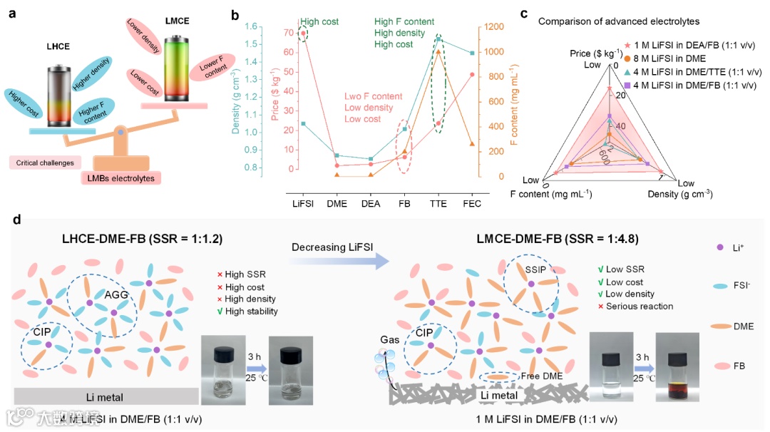 基于低成本、低密度、低粘度及低氟取代的氟苯(FB)稀释剂与1,2-二甲氧基乙烷(DME)溶剂的局部高浓度电解质已成功应用于高性能锂金属电池。然而,其高盐-溶剂摩尔比导致高生产成本和巨大环境负担。在不牺牲电化学性能的前提下降低盐-溶剂摩尔比仍具挑战。