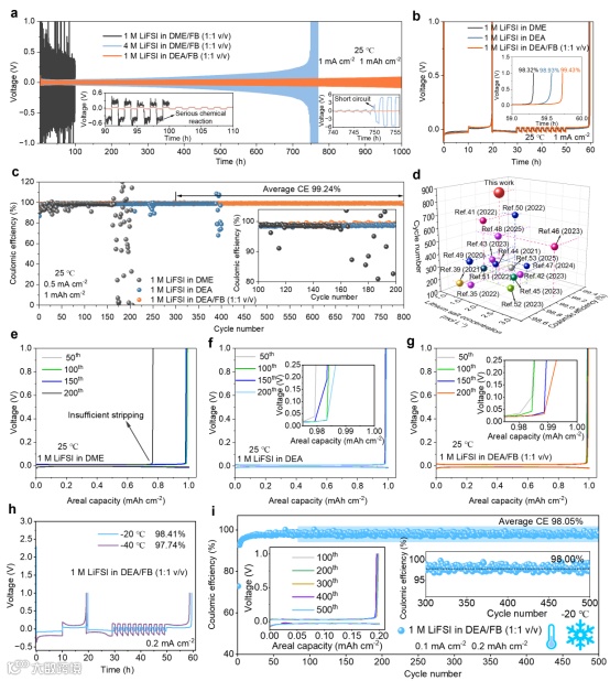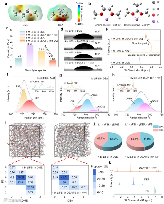 DEA溶剂不仅具备低凝固点(-113°C)和低介电常数,利于低温应用,其与Li⁺的较弱结合能也促进了快速的界面脱溶剂过程。光谱与模拟结果一致表明,即使在1 M的低盐浓度下,DEA/FB体系仍能形成丰富的接触离子对和离子聚集体,构建“阴离子优先”的溶剂化结构。这种结构源于DEA的支链空间位阻与FB的调控作用,共同促进了富LiF的稳定SEI生成,为高性能锂金属电池奠定了微观基础。