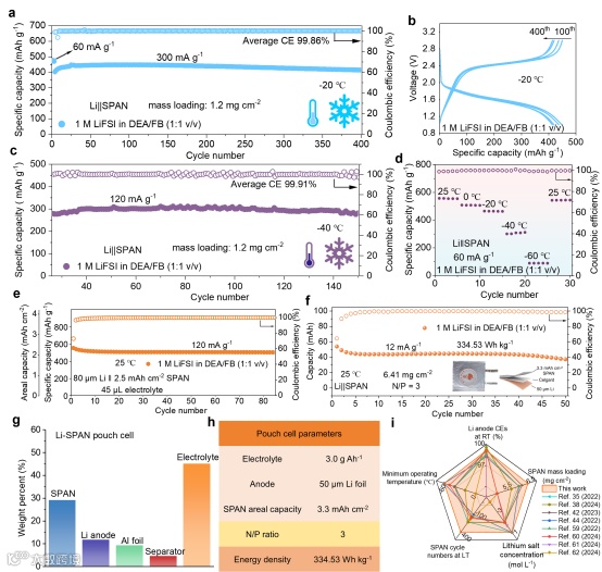 该电解质体系展现出良好的环境适应性。Li||SPAN电池在-20 ℃循环400次后容量保持率高达103.1%,在-40 ℃循环150次后仍保持100.8%的容量,甚至在-60 ℃的超低温下也能正常工作。在高负载正极(2.5 mAh cm-2)和贫电解液(3 g Ah-1)的实用化条件下,软包电池仍能稳定循环,并实现334.53 Wh kg-1的高重量能量密度。这证明了该LMCE体系具备从实验室走向实际应用的巨大潜力,尤其适用于宽温域、高比能的应用场景。