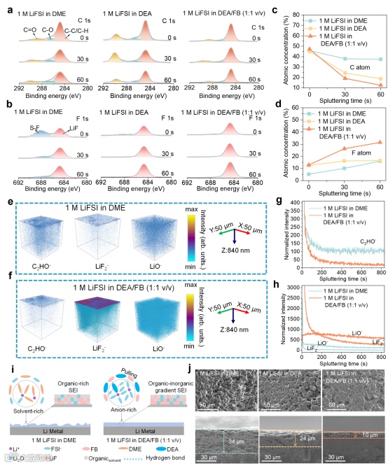 通过XPS和TOF-SIMS对循环后锂金属表面的SEI进行深度剖析,发现DEA/FB电解质诱导形成了独特的有机-无机梯度结构。该SEI内层富含LiF等无机物,外层有机物含量低,且随深度增加LiF含量持续上升。这种致密且坚固的界面层能有效抑制锂枝晶生长和溶剂持续分解,使锂沉积层更加均匀、紧密(厚度仅10 μm),为实现长寿命锂金属电池提供了关键的界面保障。