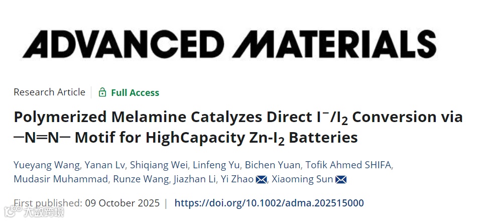 Wang, Y.; Lv, Y.; Wei, S.; Yu, L.; Yuan, B.; Shifa, T. A.; Muhammad, M.; Wang, R.; Li, J.; Zhao, Y.; Sun, X. Polymerized Melamine Catalyzes Direct I−/I2 Conversion via -N═N- Motif for High-Capacity Zn-I2 Batteries. Adv. Mater. 2025. e15000.