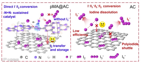 图1. pMA@AC 正极通过pMA与碘物种之间相互作用,分别催化I-/I⁰和I+I-/I⁰/I+转化反应的示意图