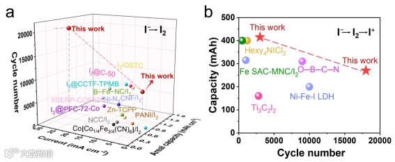 图 2. pMA@AC 电池与已报道的碘基正极的电池性能对比,分别对应(a)两电子转移反应和(b)四电子转移反应