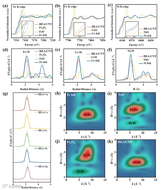 图3. HEA/CNT的原子结构分析。a) Fe、b) Co和c) Ni K边的XANES光谱;d) Fe、e) Co和f) Ni K边的FT-EXAFS光谱;g) HEA/CNT中X射线探测元素的FT-EXAFS光谱叠加图;h) Fe箔、i) FeO、j) Fe₂O₃和k) HEA/CNT的k³加权EXAFS信号小波变
