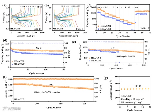 图6. a) HEA/CNT和b) MEA/CNT电池在不同倍率下的GCD曲线;c) HEA/CNT和MEA/CNT电池的倍率性能;d) HEA/CNT和MEA/CNT电池在0.2C下的循环性能;e) HEA/CNT和MEA/CNT电池在2C下的长期循环稳定性;f) HEA/CNT电池在10C下的循环性能;g) HEA/CNT软包电池在0.1C下的循环性能。