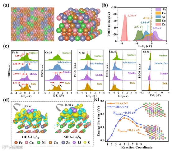 图8. a) HEA/CNT优化结构的构型;b) HEA/CNT的PDOS;c) HEA/CNT中Fe、Co、Ni、Cu和Zn元素的位点依赖PDOS;d) Li2S4在HEA/CNT和MEA/CNT上吸附的差分电荷密度图,黄色表示电子积累,青色表示电子耗尽,标注值为基于Bader电荷分析从催化剂转移到Li2S4的电荷量;e) Li2S在HEA/CNT和MEA/CNT表面的分解势垒。