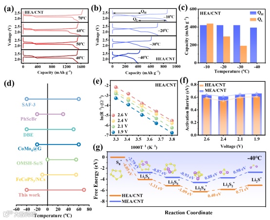 图7. HEA/CNT电池在0.1C下从a) 40至70℃和b) -40至-10°C的GCD曲线;c) HEA/CNT和MEA/CNT电池的容量对比;d) 本工作与文献报道的工作温度范围对比;e) 由EIS曲线计算的HEA/CNT电池Arrhenius图;f) HEA/CNT和MEA/CNT电池在指定放电电压下的活化能垒;g) -40°C下HEA/CNT和MEA/CNT表面SRR的吉布斯自由能。