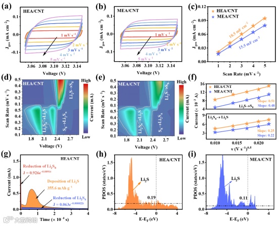 图4. a) HEA/CNT和b) MEA/CNT在非法拉第区间测试的CV曲线;c) 由CV获得的催化剂的Cdl结果;不同扫速下d) HEA/CNT和e) MEA/CNT的CV曲线等高图;f) 还原氧化过程中ν¹/²与电流的线性拟合;g) HEA/CNT上Li2S成核实验的恒电位放电曲线;Li2S吸附在h) HEA/CNT和i) MEA/CNT上的PDOS。