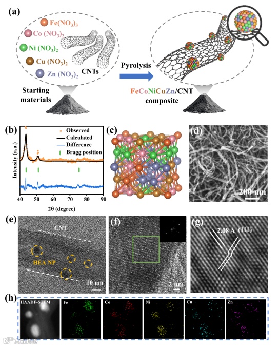 图2. a) HEA/CNT的合成示意图;b) HEA/CNT的XRD精修图谱;c) HEA的FCC结构示意图;d) HEA/CNT的SEM图像、e) TEM图像、f) HRTEM图像及g) (f)中绿色标记区域对应的IFFT图像;h) HEA/CNT的HAADF-STEM图像及元素分布图。