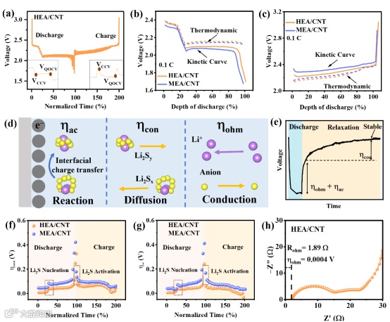 图5. a) HEA/CNT电池的GITT图;b) 放电和c) 充电过程中的热力学与动力学曲线;d) 电极反应过程示意图,涉及界面电荷转移、反应物种扩散(Li2Sx, 6≤x, Li2Sy, 4≤y≤6)和电解液离子传导,分别产生ηac、ηcon和ηohm;e) GITT动力学极化解耦方法机制;f) ηtotal与归一化充放电时间;g) Li-S扣式电池的ηac;h) HEA/CNT电池的Nyquist图。