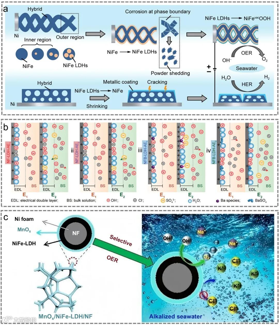 实现“碳中和”目标,关键在于构建以绿氢为核心的清洁能源体系。当前,电解水制氢是生产绿氢的主流技术,但其发展受限于日益紧张的淡水资源。与之相比,海水占全球水储量的96.5%,是近乎无限的原料宝库。直接电解海水制氢技术,不仅能规避淡水短缺和预处理成本高的问题,更能与丰富的海上风电、光伏等可再生能源高效耦合,形成“可再生能源-海水电解-绿氢”的完美闭环,被认为是实现大规模、低成本绿氢生产的破局之道。然而,海水中高浓度的氯离子及其他复杂成分,给析氧反应这个制氢过程的“效率瓶颈”带来了严峻挑战:竞争性析氯反应、催化剂腐蚀、活性位点沉淀失活等问题,严重制约了电解效率与装置寿命。因此,开发能够在这一“恶劣”环境中高效、稳定工作的廉价阳极催化剂,成为推动该技术落地的核心。在众多非贵金属催化剂中,镍铁层状双氢氧化物因其独特的层状结构、高本征活性和可调控的电子特性,被视为最具潜力的候选者之一。