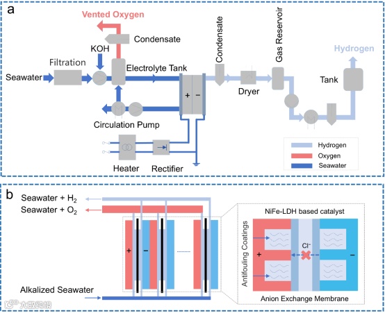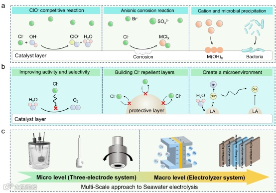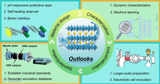 要点:本图将海水电解的复杂困境归纳为四大挑战,并创新性地提出了从原子级调控到电解槽设计的全链条解决方案框架,为研究者指明了攻坚方向。