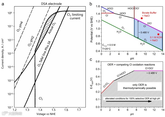 要点:析氧反应与析氯反应在阳极上演着激烈的“竞争”。本图通过热力学相图清晰划定了各自的“优势区”,指出调控电位与pH是确保氧气“胜出”的关键。