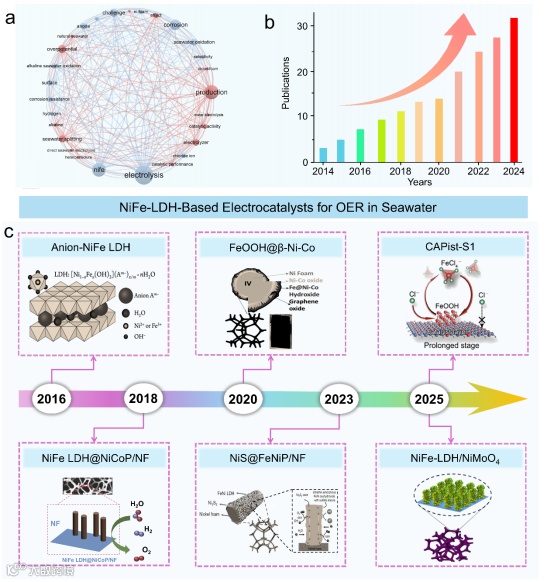 通过关键词图谱与年度发文量,直观展示了NiFe-LDH在海水电解领域迅速成为研究热点的历程,其研究网络紧密围绕“异质结”、“缺陷工程”等前沿方向展开。