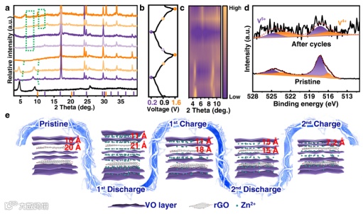 图6. (a-b) 循环后ex-situ XRD显示层间距变化。(c) 前两次充放电循环的XRD等高线图,显示层间距动态调整。(d) 循环后V2p XPS显示V4+含量增加,证实Zn2+存储。(e) GV在充放电过程中层间距变化示意图。