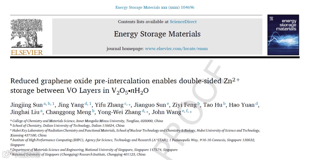 近日,内蒙古民族大学、湖北科技学院、新加坡科技局和新加坡国立大学等的联合研究团队,在国际知名期刊《Energy Storage Materials》上发表了一项题为“还原氧化石墨烯预插层实现V2O5·nH2O层间双面Zn²⁺存储”的研究成果。该研究创新性地采用了一种还原氧化石墨烯(rGO)预插层策略,成功将rGO纳米片稳定地嵌入到VOH的层状结构之中。