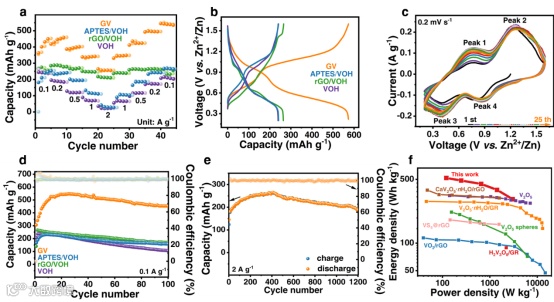 图5. (a) GV在不同电流密度下的倍率性能,显示高比容量。(b) 0.1 A g−1下GV、APTES/VOH、rGO/VOH和VOH的充放电曲线,GV具有清晰平台。(c) GV在0.2 mV s−1下的CV曲线,显示高可逆性。(d) 0.1 A g−1下循环性能,容量达548 mAh g−1,100次后保持452 mAh g−1。(e) 2 A g−1下长循环性能,1200次后容量保持191 mAh g−1。(f) 能量密度和功率密度对比,GV达到517.8 Wh kg−1和3032 W kg−1,优于其他钒基材料。