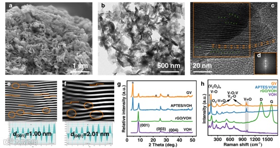 图3. (a) SEM图像显示GV呈堆叠卷曲的带状结构。(b-c) TEM图像显示GV的薄而卷曲的碎片,与rGO/VOH的物理负载不同。(d) FFT显示两种晶格条纹,对应1.00和2.01 nm层间距。(e-f) 晶格条纹显示层间距和结构缺陷。(g) XRD图案显示新衍射峰,对应扩大层间距。(h) 拉曼光谱显示GV无典型rGO D和G峰,表明rGO分子级插入。
