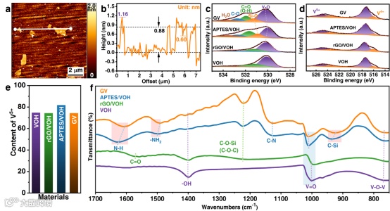 图2. (a-b) GO的AFM图像和线剖面显示其单层或双层结构,厚度约0.88 nm。(c) O1s XPS光谱显示GV中V-O键结合能变化,表明rGO与VOH形成化学键。(d) V2p XPS光谱显示GV中V5+含量降低,证实键合变化。(e) V5+含量条形图。(f) FTIR光谱显示GV中V=O键蓝移和N-H键红移,表明强化学相互作用。