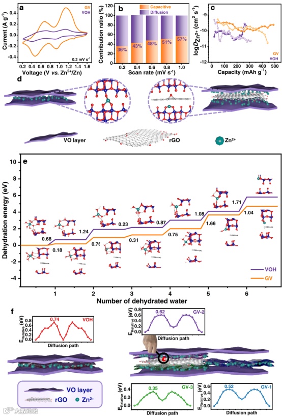 图4. (a) GV和VOH的CV曲线,GV具有更小极化。(b) GV在不同扫速下的电容贡献,随扫速增加从36%升至57%。(c) GITT测试显示GV的Zn2+扩散系数高于VOH。(d)Zn2+在VOH和GV中的存储模型,GV实现双面存储。(e) Zn(H2O)62+脱水过程势能面,GV脱水能更低。(f)Zn2+扩散能垒,GV为0.52 eV,低于VOH的0.74 eV。