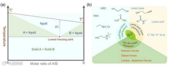 共晶电解质通常由两种或多种单独存在的固体成分组成,但在室温下以特定摩尔比结合时形成均匀的液体。这种相变产生于混合物凝固点的降低,最低可达到的凝固点称为共晶点。冰点降低的程度(ΔTf)取决于分子结构、介电常数、偶极矩和化学计量比等因素。这些变量共同影响分子间力(氢键作用力,路易斯酸碱作用力,范德华作用力),其中组分之间更强的相互作用导致更大的ΔTf值。共晶电解质具有低蒸气压(通常在373 K时<100 Pa)、热稳定性、不可燃性、化学稳定性和成分可调性等电解质所需的关键特性。