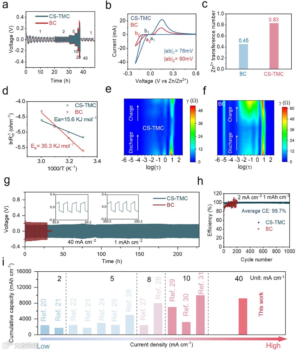 电化学测试证实,CS-TMC纤维素隔膜显著提升了锌离子迁移数、降低了脱溶剂化能垒并减少了界面阻抗。更高的迁移数抑制了浓度极化,更低的脱溶剂化能加速了沉积动力学,而更小的阻抗则确保了界面的快速电荷转移。这一协同效应显著增强了纤维素隔膜在高倍率充放电条件下的稳定性,为其在大电流场景中的应用提供了关键支撑,实现了在40 mA cm−2的大电流密度下的稳定循环。