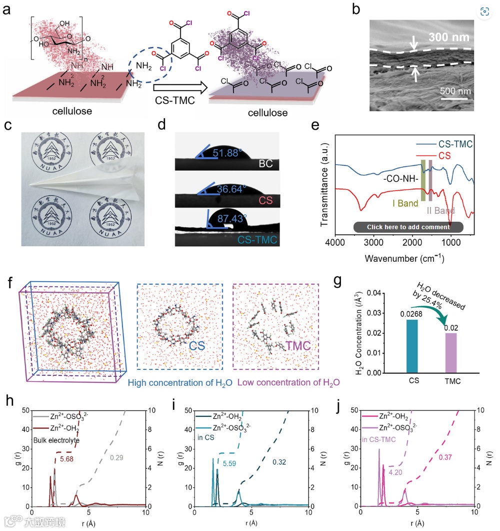 本文展示了一种用于高倍率性能锌离子电池的纤维素隔膜的串联化学设计。作为概念验证,壳聚糖(CS)和三甲酰氯(TMC)通过原位聚合方法在纤维素基底上实现。内部的CS与菌纤维素交联,富含亲锌的─OH基团,可增强电解液的润湿性、吸收速率,并通过整体隔膜快速传输Zn2+;同时,外层的TMC接枝疏水性基团(如苯环和酰氯)有助于水合Zn2+的脱溶剂化,并通过降低活性水含量抑制界面副反应。因此,串联化学设计能够同时加速Zn2+的传输和脱溶剂化,并抑制界面副反应。这种界面串联化学设计,使纤维素隔膜在高倍率水系电池中的应用成为可能。