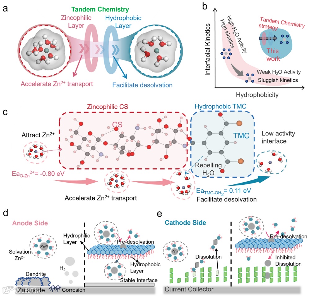 通过亲锌疏水串联化学设计在提高锌离子离子电导率同时降低水活性对电池的破坏,这种亲锌-疏水的串联化学设计理念,构建了一个功能分区的电解液微环境。亲锌位点通过强烈的分子间相互作用,高效地引导和“拉动”锌离子的快速定向迁移,从而显著提升锌离子电导率;疏水界面层可以辅助脱溶,进一步加速界面反应动力学。同时,界面疏水层可以束缚和限制水分子的移动与反应活性,从源头上降低了水引发的副反应(如腐蚀、析氢)对电池的破坏。
