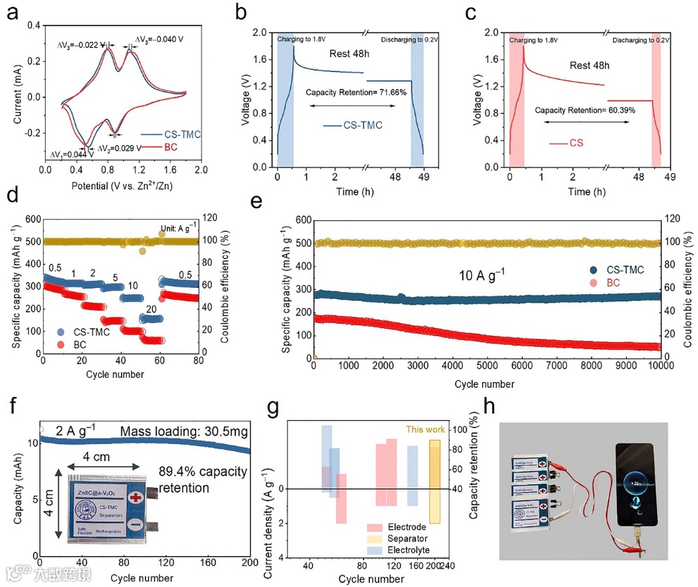 近日,吉林大学韩炜、南航申来法、陈铎团队在Advanced Functional Materials期刊发表了题为“Unlocking the Potential of Cellulose Separators for High-Rate Performance in Zinc-Ion Batteries via Interface-Engineered Tandem Chemistry”的研究论文,提出了一种纤维素膜的界面串联化学设计,在纤维素表面集成了壳聚糖−三甲酰氯(CS-TMC)层,内部的壳聚糖与纤维素交联,富含亲锌的−OH 基团,提高了隔膜的润湿性、电解质吸液率以及 Zn2+ 在隔膜体内的传输速度;外部接枝的三甲酰氯带有苯环和酰氯等疏水基团,有助于促进水合Zn2+ 的去溶剂化,并通过减少活性水的量来抑制界面副反应。因此, CS-TMC 隔膜可以让Zn||Zn对称电池在 40 mA cm−2的高电流密度下实现超过 4500 次的长循环寿命,超过了大多数已报道的纤维素基隔膜。此外,CS-TMC 隔膜还能保护氧化钒正极不溶解,在 10 A g−1的电流密度下可提供 270 mAh g−1的容量,并在 10000 次循环后保持 98.2%,证明了纤维素隔膜的串联化学设计在实际应用中的巨大潜力。