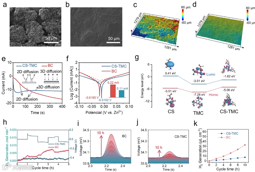 该改性策略对稳定锌沉积与抑制析氢反应均展现出显著效果。一方面,它通过均匀锌离子传输路径,加快离子传导速率,实现了致密、无枝晶的锌沉积形态,从根本上提升了沉积/剥离过程的可逆性;另一方面,通过Dems和原位气相色谱分析,证明其对析氢副反应具有良好的抑制作用。