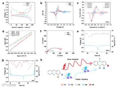 图2. PNZ和PNZ–I2的动力学评估。(a) Zn//PNZ和Zn//PNZ–I2电池在1.0 A g–1电流密度下的恒电流充放电曲线。(b) 两种电池的dQ/dV–1结果。(c) Zn//PNZ–I2电池在0.2至4.0 mV·s–1扫描速率下的循环伏安曲线。(d) 由循环伏安结果得到的log(峰值电流, mA)与log(扫描速率, mV·s–1)在不同扫描速率下的线性关系。(e) 两种电池的电化学阻抗谱结果。(f和g) 两种电池的恒电流间歇滴定技术结果。(h) PNZ和PNZ–I2慢速与快速动力学示意图。