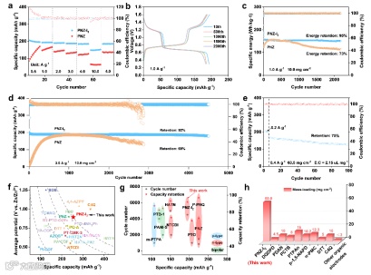 图4. Zn//PNZ和Zn//PNZ−I2电池的循环性能。(a) 两种电池在不同电流密度下的比容量。(b) Zn//PNZ−I₂电池在第10、500、1000、1500和2000次循环时的恒电流充放电曲线。(c) Zn//PNZ−I2电池与Zn//PNZ电池在1.0 A·g−1电流密度下的循环性能。(d) Zn//PNZ−I2电池在3.0 A·g−1电流密度下的循环性能。(e) 面载量为60.0 mg·cm−2的Zn//PNZ−I2电池在0.4 A·g−1电流密度下的循环性能。(f−h) PNZ−I2电极与代表性的p型、n型及双极型有机正极材料之间的电化学性能对比。