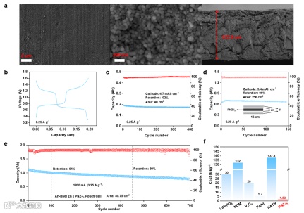 图5. Zn//PNZ−I2软包电池验证。(a) PNZ−I2正极的SEM图像,展示了平面和截面视图。(b) Zn//PNZ−I2在0.25 A·g−1下的恒电流充放电曲线。(c) 面积为40 cm2的Zn// PNZ−I2软包电池的循环性能。(d) 面积为256 cm2的Zn// PNZ−I2软包电池的循环性能。(e) 面积为80.75 cm2的Ah级Zn// PNZ−I2软包电池的循环性能。(f) 所呈现的原始正极材料价格与PNZ−I2的对比。