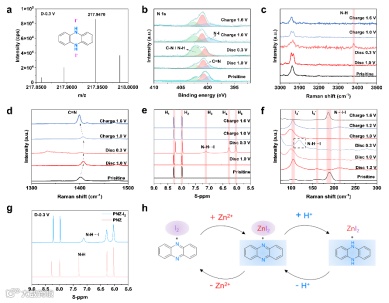 图3. PNZ–I2正极的氧化还原机理、中间产物及光谱表征。(a) 中间产物的质谱。(b) PNZ–I2正极在不同状态下的N 1s XPS光谱。(c, d) PNZ–I2正极中PNZ在不同状态下的拉曼光谱。(e) PNZ–I2正极在不同状态下的1H NMR。(f) PNZ–I2正极中I2在不同状态下的拉曼光谱。(g) 两种电池中中间产物的1H NMR。(h) PNZ–I2的氧化还原机理。除中间产物的电化学转化外,还包括电子和质子的插层与脱出。