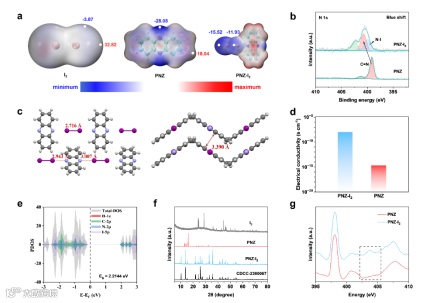 综合运用分子静电势分析、X射线光电子能谱、单晶X射线衍射、电导率测试、态密度计算、X射线吸收近边结构谱、拉曼光谱及核磁共振等多种表征技术,系统阐明了吩嗪(PNZ)与碘(I2)形成的电荷转移复合物(PNZ–I2)的结构与性能。本研究为利用电荷转移复合物设计高性能储能电极材料提供了坚实的理论和实验基础。