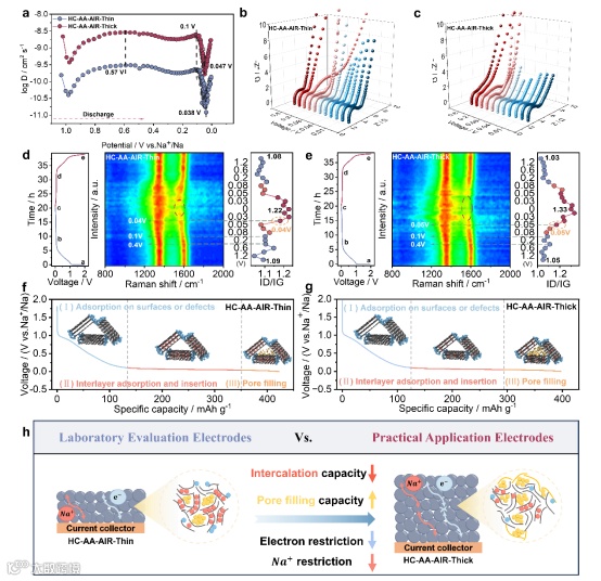 图 5. (a) 薄电极与厚电极的恒电流间歇滴定技术(GITT)曲线;(b, c) 薄电极与厚电极在放电过程中的原位电化学阻抗谱(EIS)曲线;(d, e) 薄电极与厚电极在首次充放电过程中的原位拉曼光谱;(f, g) 放电过程中钠离子存储行为示意图;(h) 薄电极与厚电极钠离子存储行为转变示意图。