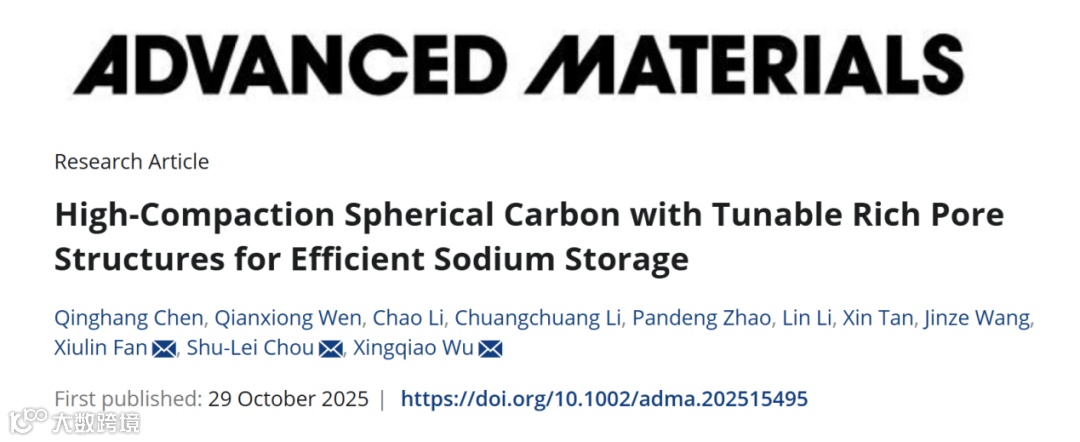 近日,温州大学吴星樵/侴术雷与浙江大学范修林合作在Advanced Materials上发表了题为“High-Compaction Spherical Carbon with Tunable Rich Pore Structures for Efficient Sodium Storage”的研究论文,提出了预孔工程策略对硬碳的孔隙结构进行精确调控。通过深共晶溶剂的水热法实现了单分散微孔球形硬碳的可控合成。在经过微观与介观尺度的双重调控,该材料展现出优异的电化学性能,其可逆容量达 375.40 mAh/g,首次库伦效率达 90.10%。当厚电极受到更高压实处理时,其球形形貌使其仍能保持较高的克容量(359.49 mAh/g),同时体积比容量得到提升(390.30 mAh/cm³)。与普鲁士蓝正极组装成扣式全电池时,电池能量密度高达 318.44 Wh/kg。同时,在宏观层面阐明在低电位下实验室制备与实际应用电极的钠嵌入及孔填充过程存在差异背后的机制,为开发高能量密度钠离子电池提供了宝贵指导。