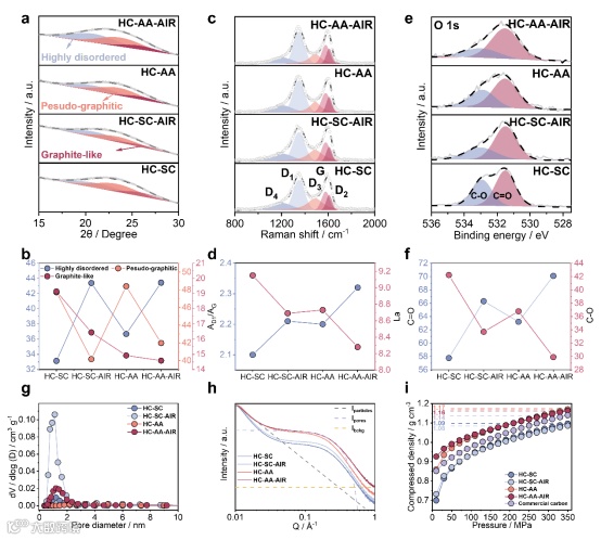 图 2. 四种样品的表征数据 (a, b) X 射线衍射(XRD)图谱及拟合后三个区域的面积百分比;(c, d) 拉曼(Raman)图谱、AD1/AG 值及 La 值;(e, f)样品X射线光电子能谱(XPS)的 O 1s轨道拟合结果及C-O键、C=O键基团的变化趋势;(g)孔径分布;(h) 小角X射线散射(SAXS)谱图;(i) 压实密度变化趋势。