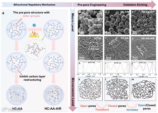 2)策略与验证:通过调控表面亲疏水性与碳链空间位阻效应,合成了具有扩大自由体积的球形碳材料,有效促进了闭孔形成并抑制了开孔。后续通过氧化蚀刻精准调控微孔结构,成功制备出兼具高压实密度、丰富孔结构和优异储钠性能的硬碳材料。优化后的材料在20 mA g⁻¹电流密度下可实现375.40 mAh g⁻¹的可逆容量和90.1%的首次库仑效率,在高面密电极条件下仍保持359.49 mAh g⁻¹的克容量和390.30 mAh cm⁻³的体积容量,其综合性能显著优于传统硬碳材料。