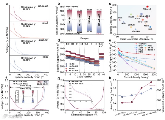 图 4. (a) 四种样品在半电池中的首次充放电曲线;(b) 四种样品在半电池中第二次循环放电曲线的斜线段容量与平台段容量;(c) HC-AA-AIR 与文献中已报道的其他硬碳负极的首次库伦效率(ICE)及比容量对比;(d) 四种样品的倍率性能;(e) HC-AA-AIR 与文献中已报道的硬碳负极的倍率性能对比;(f) 半电池中薄电极与厚电极的首次充放电曲线对比; (g)薄电极与厚电极的归一化充放电曲线;(h) 四种样品的面容量与体积容量。