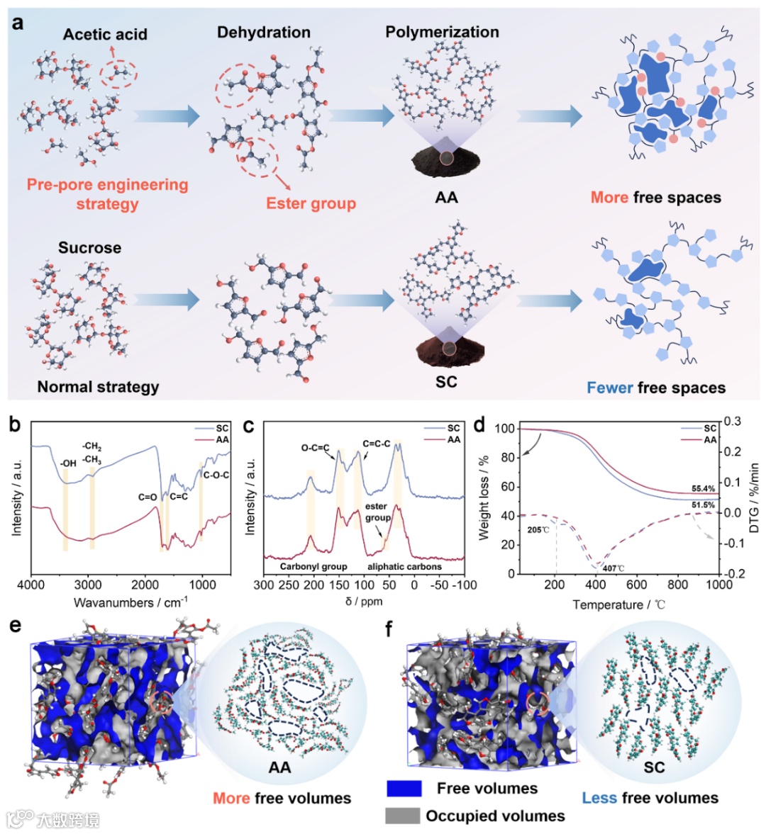 图 1. (a) 合成过程示意图;(b) 傅里叶变换红外(FTIR)光谱;(c) ¹³C 核磁共振(NMR)光谱;(d) AA与SC的热重分析(TGA)与微分热重分析(DTG)曲线;(e) AA与 (f) SC 自由体积的计算模拟模型。